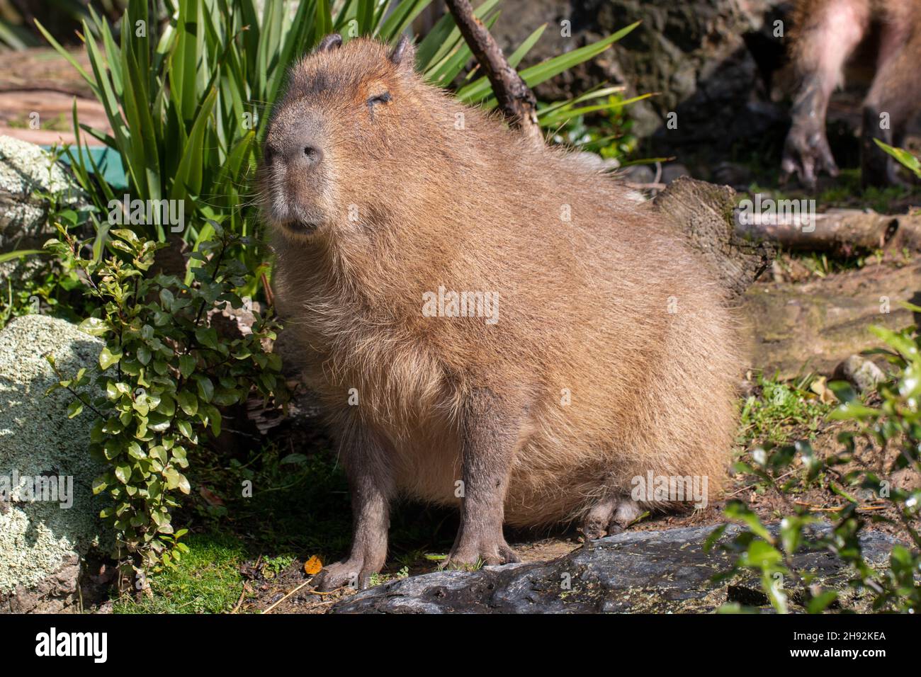 Capybara Sitting On A Rock Amongst Some Plants At Wellington Zoo New Zealand Stock Photo Alamy